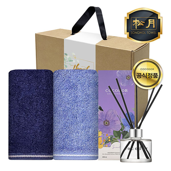 송월타월2장, 코코도르 디퓨저 1개, 일체형 손잡이박스, 속지, 감사스티커(랜덤)