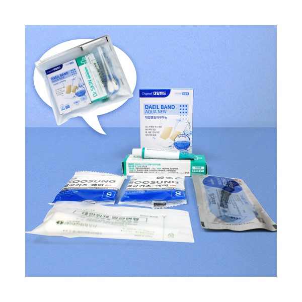 | 기타사항 | 대일밴드 아쿠아 방수밴드 오리지널8매+대형4매 +닥터스킨연고+멸균가제2매+스틱스왑+멸균면봉+지퍼백 지퍼백 실크1도 인쇄 및 스티커 부착 별도문의 종이케이스 추가 별도문의 |