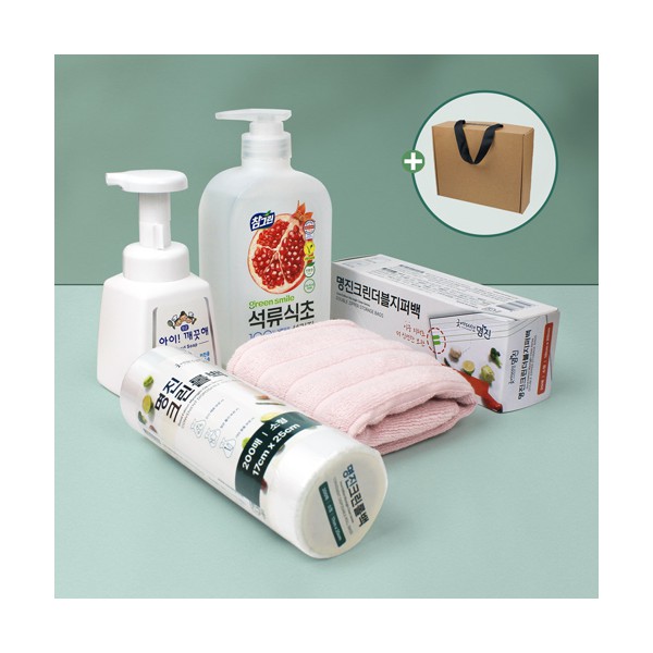 기타사항 참그린 친환경 프리미엄 석류식초 주방세제 + 주방전용 아이깨끗해 + 더블지퍼백 + 크린롤백 + 순면 골지 주방타올 + 끈케이스