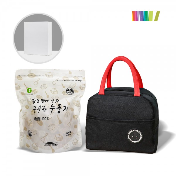 | 인쇄 | 1도 실크인쇄(보냉백, 종이케이스 中 1곳 인쇄) | 재질 | 누룽지(국산쌀 100%), 보냉백(폴리에스터,알루미늄호일) |